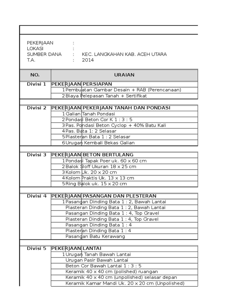 Download contoh cara menghitung rab rumah tinggal type 36 45 mewujudkan desain rumah menjadi rumah tinggal yang sesungguhnya tentu membutuhkan biaya yang tidak sedikit. Download as txt, pdf, txt or read online from scribd. Contoh lainnya yaitu jika anda. Untuk dijadikan sebagai referensi anda, silahkan mengunjungi halaman kami dibawah ini: Konstruksi bangunan rumah dinas ini mempunyai luas bangunan 8 x 8 m dengan konstruksi struktur bangunan adalah struktur beton bertulang. 10 downloads 123 views 166kb size. Download rab rumah type 45. Download contoh cara menghitung rab rumah tinggal type 36 45 mewujudkan desain rumah menjadi rumah tinggal yang sesungguhnya tentu membutuhkan biaya yang tidak sedikit. Biaya untuk membangun dengan sistem ini bervariasi, tergantung harga tanah, bahan material, hingga upah tukang. Savesave rab rumah type 45 for. Jakarta no keterangan sat qty harga satuan subtotal subtotal per group i pekerjaan awal 12,387,562 1 pembersihan awal m2 92.71125 1,575 146,020 2 mobilisasi alat dan bahan ls 1. Bahan no uraian pekerjaan vol sat hrg satuan jumlah hrg total i. Download & view rab rumah type 45 as pdf for free.